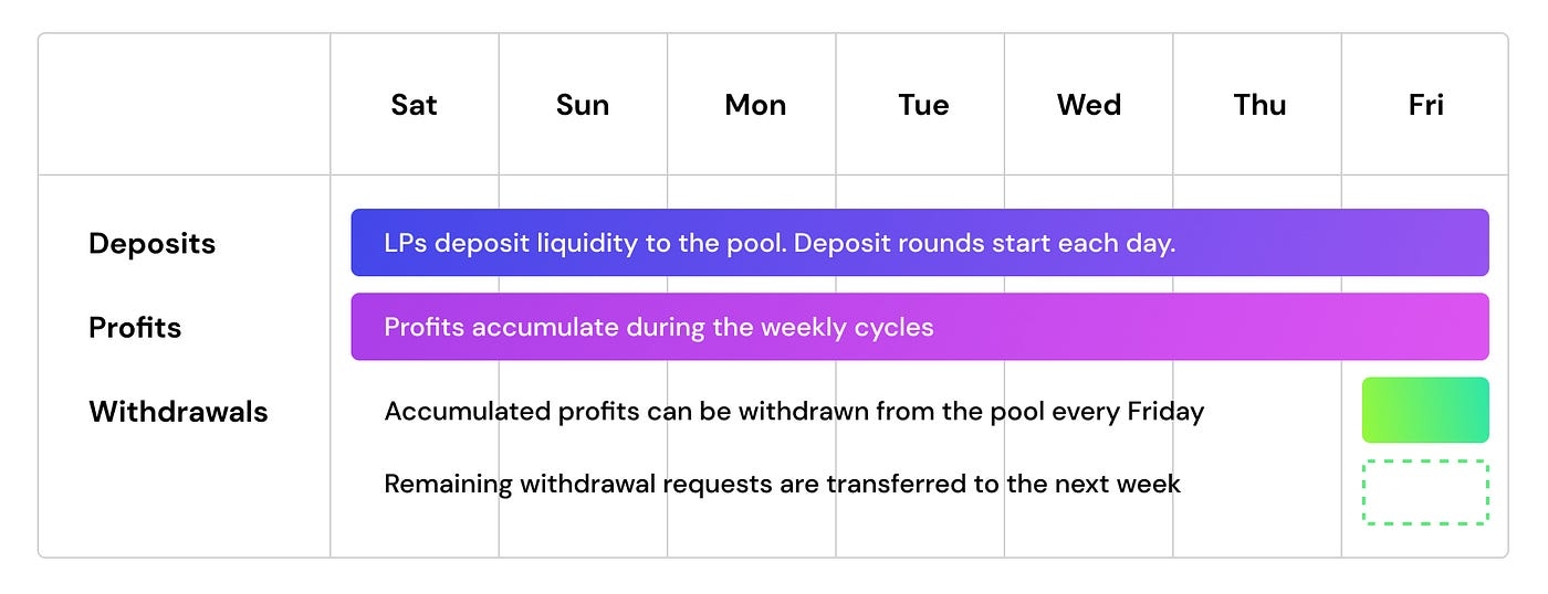 Weekly withdrawal rounds enable the protocol to decouple the time it takes for an LP to withdraw funds from the duration of options in the pool portfolio. Any incoming cash flow into the pool first gets allocated towards outstanding withdrawal requests and only the remainder is released into the pool liquidity. Cash inflows occur in the following instances: